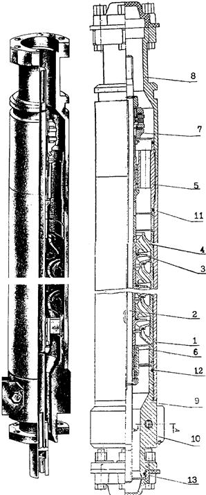 Модуль-секция насоса (рис.10.2) состоит из корпуса 1, вала 2, пакетов ступеней (рабочих колес – 3 и направляющих аппаратов – 4), верхнего подшипника 5, нижнего подшипника 6, верхней осевой опоры 7, головки 8, основания 9, двух ребер 10 (служат для защиты кабеля от механических повреждений) и резиновых колец 11, 12, 13.