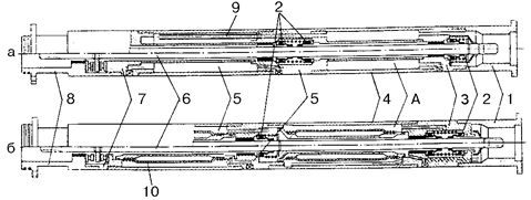 а – открытого типа; б – закрытого типа А – верхняя камера; Б – нижняя камера; 1 – головка; 2 – торцевое уплотнение; 3 – верхний ниппель; 4 – корпус; 5 – средний ниппель; 6 – вал; 7 – нижний ниппель; 8 – основание;