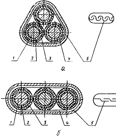 Кабель состоит из трех жил, каждая из которых имеет слой изоляции и оболочку; подушки из прорезиненной ткани и брони. Три изолированные жилы круглого кабеля скручены по винтовой линии, а жилы плоского кабеля – уложены параллельно в один ряд.