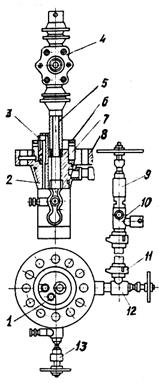Для герметизации устья нефтяных скважин, эксплуатируемых погружными центробежными, винтовыми и диафрагменными электронасосами, применяют устьевую арматуру типа АУЭ-65/50-14 или устьевое оборудование типа ОУЭ‑65/50‑14. Арматура типа АУЭ-65/ 50 – 14 состоит из корпуса, трубной подвески, отборника давления с пробоотборником, угловых вентилей, перепускного клапана и быстросборного соединения (рис. 11.1).