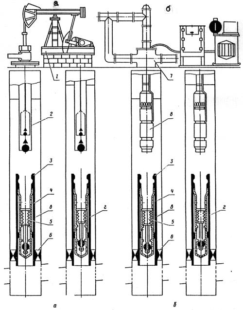 6 – пакер 2ПД-ЯГ; 7 – оборудование устья скважины, эксплуатируемой центробежными электронасосами; 8 – центробежный скважинный электронасос.