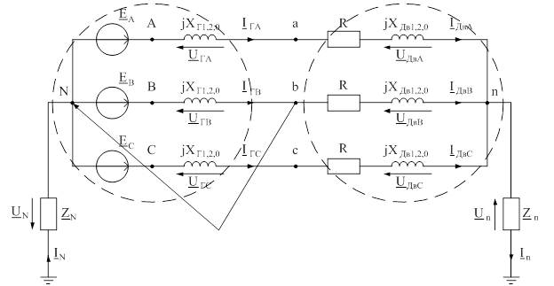 Для динамической трёхфазной цепи с симметричной системой ЭДС ЕА, ЕВ, ЕС генератора и двигателем при заданной местной несимметрии для комплексов действующих значений напряжений и токов выполнить следующее.