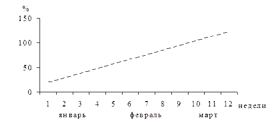 На рис 7 приведена временная зависимость эффективности рекламы за период проведения рекламной кампании товара - по неделям с января по март.