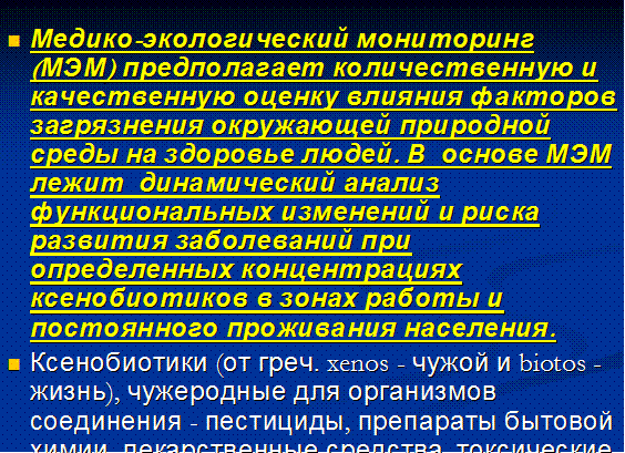Мониторинг окружающей природной среды (МОПС) - долгосрочные наблюдения за состоянием ОПС, ее загрязнением и происходящими в ней природными явлениями, а также оценка и прогноз состояния ОПС, ее загрязнения. Социально-гигиенический мониторинг (СГМ) - система организационных, социальных, медицинских, санитарно-эпидемиологических, научно-технических, методологических и иных мероприятий, направленных на организацию наблюдения за состоянием санитарно-эпидемиологического благополучия населения, его оценку и прогнозирование изменений, установление, предупреждение, устранение или уменьшение факторов вредного влияния среды обитания на здоровье человека. Социально-экологический мониторинг» (СЭМ) - система повторяющихся наблюдений за отношением населения (общественного мнения) к экологическим проблемам.