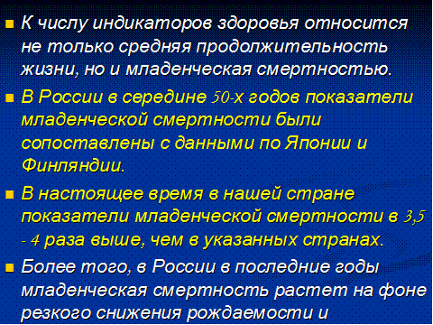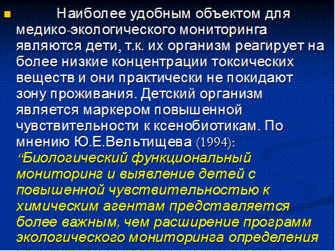 Медико-экологические исследования, проведенные в различных по природно-климатическим и социально-экономическим условиям городах, свидетельствует о перспективности экологического подхода к анализу состояния здоровья населения, прежде всего, детей.