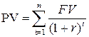 где PV – сегодняшняя ценность суммы, FV – будущие ежегодные доходы, r – ставка процента, t – количество лет.