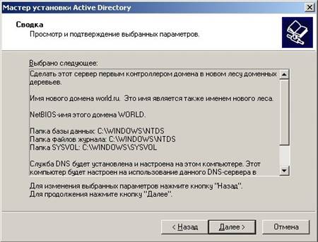 - Изучите сводку выбранных вами параметров установки контроллера домена. Если что-то задано неверно, то можно вернуться к соответствующему шагу и сделать нужные исправления. Перезагрузите компьютер по окончании работы мастера
