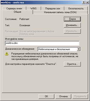 - Свойства зон, для параметра "Динамические обновления" задайте значение "Небезопасные и безопасные"