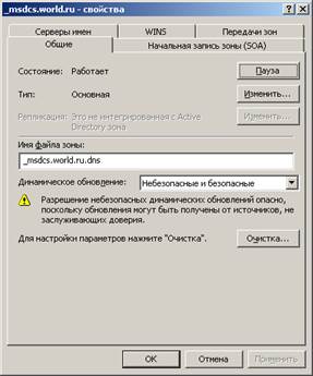 - Преобразуйте DNS-зону, соответствующую вашему домену AD, из AD - интегрированной в стандартную основную (Свойства созданных на вашем DNS-сервере зон (зоны вида world.ru и _msdcs.world.ru))
