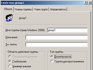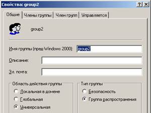 - Модифицируйте свойства групп: Область действия группы (Локальная в домене, Глобальная, Универсальная) и Тип группы (безопасность, Группа распространения)