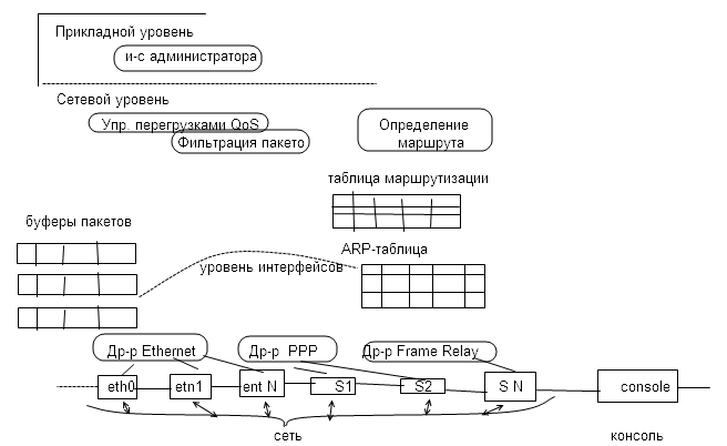 Нижний уровень, уровень интерфейсов, представлен портами маршрутизатора и драйверами протоколов канального уровня. Разделение функций между контроллером порта и драйвером зависит от реализации. Если принятый на этом уровне кадр корректен, он помещается в один из буферов пакетов в памяти маршрутизатора.
