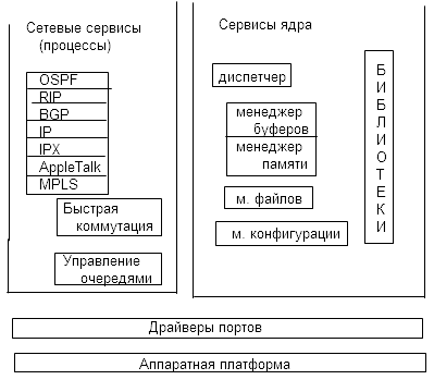 Большая часть сетевых сервисов реализуется как процессы, вызываемые диспетчером ядра. В их состав входят сервисы коммуникационных протоколов и сервисы, реализующие общие функции.