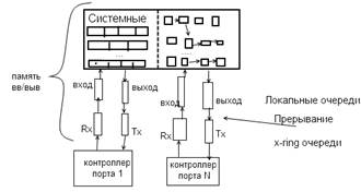 1. С каждым интерфейсом связаны две очереди Tx-ring и Rx-ring, предназначенные для приема пакетов от контроллера и передаче их в контроллер. К их указателям имеют доступ как процессор, так и контролер интерфейсов. Структура указателей и размеры ячеек Х-очередей зависит от типа интерфейса и выбираются таким образом, чтобы уместился кадр максимального для данного интерфейса размера. Если после приема кадра контроллер интерфейса не может найти в Х-очереди указателя на свободную ячейку, то фиксируется переполнение кольца и кадр теряется.