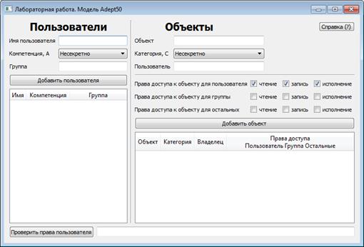 2. Диалоговое окно «Лабораторная работа. Модель АDEPT-50» является рабочим пространством для выполнения лабораторной работы. Интерфейс программа для организации системы защиты информации предприятия на основе модели АDEPT-50 показан на рис.1.