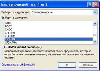 2 способ. В программе Excel собственно есть функция определения среднего арифметического. Для ее применения в ячейке А 11 поместите пояснение «Среднее арифметическое», затем для расчета самого показателя выделите ячейку В11, войдите в пункт меню «Вставка», и щелкните по пункту меню «Функция». В появившемся окне выберите категорию функции «статистические» и выберите функцию «срзнач»: