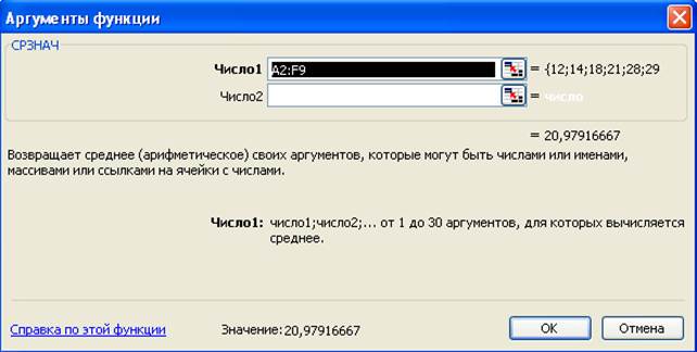 Появится окно, в раздел «Число1» которого нужно будет внести диапазон адресов ячеек с нашими данными. Это можно сделать путем простого выделения этих ячеек с помощью мыши.
