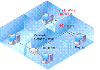IEEE 1394 сеть идеально подходит для объединения нескольких компьютеров в пределах одной квартиры, а с использованием репитера позволяет строить сеть, используя только интерфейс FireWire.