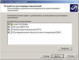 1.1 Параметры входящих соединений настраиваются с помощью «Мастера новых сетевых подключений». Чтобы его задействовать, нажмите: «Пуск»->«Настройка»-> «Панель Управления»-> «Сетевые подключения»-> «Мастер новых подключений»-> «Установить прямое подключение к другому компьютеру»-> «Принимать входящие подключения».