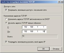 1.4. Отметьте параметр «Разрешить доступ к локальной сети», чтобы можно было обмениваться файлами, укажите диапазон IP адресов, назначаемый подключаемым пользователям. Если у вас уже есть локальная сеть, то важно чтобы они не пересекались с уже существующими IP-адресами и разрешите пользователю указывать свой IP адрес, как указано на рисунке. Серверу всегда будет назначаться первый IP адрес из диапазона, в данном случае это пример - 192.168.1.1.После всех вышеперечисленных манипуляций в папке «Сетевые подключения» появится новая запись «Входящие подключения», в ней вы всегда можете внести изменения и дополнения в настройки.