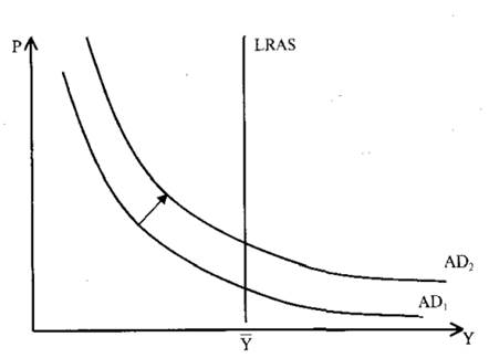 Шоки спроса (предложения) вызывают краткосрочные колебания в уровне выпуска. Для преодоления последствий шоков обычно проводится политика стабилизации, направленная на поддержание объема производства и занятости на естественном уровне. Предположим, что возросла скорость обращения денег (например, в связи с введением банковских автоматов). Тогда спрос на деньги уменьшится, а совокупный спрос при каждом возможном уровне цен увеличится (кривая AD сдвинется вправо).