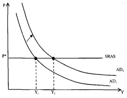 В краткосрочном периоде, т.е. в предположении о жесткости цен, совокупное предложение SRAS имеет вид горизонтальной линии — при заданном общем уровне иен объем выпуска Y определяется в зависимости от совокупного спроса (см. рис.2.3).