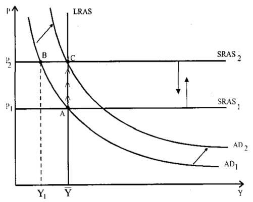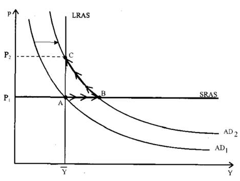 Если экономика первоначально находилась в состоянии краткосрочного равновесия, совпадающего с долгосрочным (т.е. на естественном уровне выпуска, например, в т. А на рис.2.4), то в краткосрочном периоде это вызовет бум и повышение уровня выпуска (новое краткосрочное равновесие в т. В), а в долгосрочном периоде это приведет только к увеличению иен (т. С - новое долгосрочное равновесие). Политика стабилизации, т.е. предотвращения краткосрочных колебаний выпуска, в данном случае должна состоять в ограничении совокупного спроса путем, например, уменьшения предложения денег.