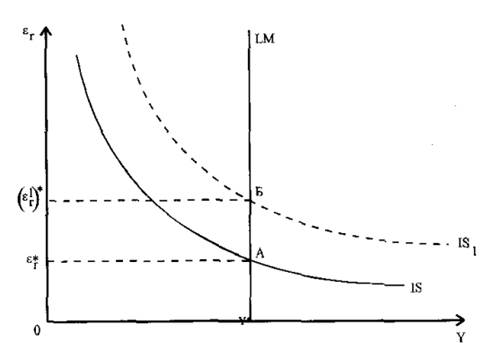 В краткосрочном периоде равновесие перейдет из точки А в точку Б (доход останется на прежнем уровне, реальный обменный курс повысится). Это происходит из-за того, что стимулирующая бюджетно-налоговая политика приводит к повышательному давлению на внутреннюю ставку процента. Капитал устремляется из-за рубежа в страну, обменный курс растет, чистый экспорт падает. Таким образом, стимулирующая бюджетно-налоговая политика приводит к росту реального обменного курса и вытеснению чистого экспорта.