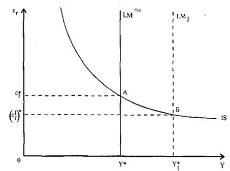В краткосрочном периоде равновесие перейдет из точки А в точку Б, равновесное значение реального обменного курса понизится, а доход увеличится. Это происходит потому, что увеличение предложения денег оказывает понижательное давление на ставку процента, что приводит к оттоку капитала за границу, падению реального обменного курса, а, следовательно, росту чистого экспорта и дохода. Таким образом, в краткосрочном периоде стимулирующая кредитно-денежная политика приводит к увеличению дохода.
