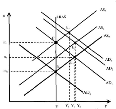 Пусть первоначально экономика находилась в состоянии Е, характеризующемся потенциальным выпуском и уровнем инфляции, совпадающим с темпом роста денежной массы m0. Увеличение темпа роста денежной массы до m1 будет означать в краткосрочном периоде увеличение как темпа инфляции до π1, так и уровня выпуска до Y1, в связи с ростом совокупного спроса и перемещением его вправо в положение AD1. Увеличение инфляции до π1, в новом состоянии краткосрочного равновесия Е1 вызовет увеличение ожидаемой инфляции и совокупное предложение уменьшится и сдвинется в положение AS2. Уровень выпуска в новом краткосрочном равновесии Е1, выше, чем в Е, следовательно, в следующем периоде совокупный спрос возрастет и сдвинется в положение AD2. Новое краткосрочное состояние равновесия Е2 характеризуется более высоким уровнем выпуска, следовательно, увеличится совокупный спрос будущего периода, и более высоким уровнем инфляции - следовательно, увеличится ожидаемая инфляция и сдвинется вверх совокупное предложение. Таким образом кривые спроса и предложения смещаются до тех пор, пока не достигается точка долгосрочного равновесия E', в которой выпуск находится на уровне потенциального, а уровень инфляции выше первоначального и совпадает с новым темпом роста денежной массы m1. Траектория полной корректировки приведена на рис. 4.9