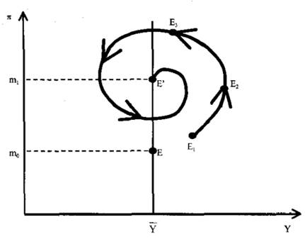 . Следовательно при неожиданном увеличении денежной массы экономика окажется в точке Е1 на рис 4.9, а уже в следующем периоде перейдет в состояние Е' с потенциальным уровнем выпуска и темпом инфляции π= m1.