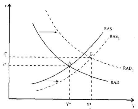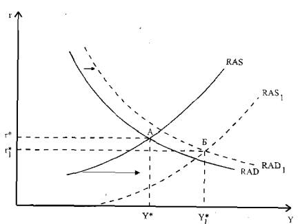 Эти изменения влияют как на кривую реального совокупного спроса, так и на кривую реального совокупного предложения. Совершенствование технологии увеличивает реальный объем выпуска (см. Главу 2 первого выпуска) при каждом уровне ставки процента, и, следовательно, сдвигает кривую реального совокупного предложения вправо-вниз. Появление новых технологий приводит к увеличению инвестиционного спроса, в результате чего кривая реального совокупного спроса сдвигается вправо-вверх.