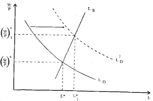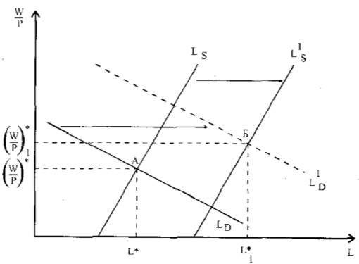 может сдвинуть график предложения труда влево-вверх и привести к снижению занятости. Рост ставки процента в результате роста инвестиционного спроса, напротив, сдвигает график предложения труда вправо-вниз. Общий эффект скорее всего выразится в сравнительно небольшом увеличении занятости. Следовательно, график реального совокупного спроса сдвинется существенно, а реального совокупного предложения - незначительно (см. рис. 5.4).