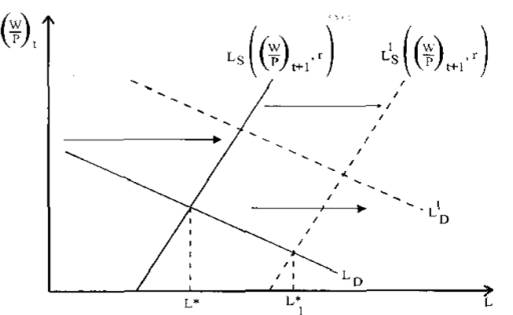 Сдвиг графика предложения труда является либо следствием временного повышения ставок заработной платы, либо ставки процента. В этом случае работники решают больше работать в настоящем и больше отдыхать в будущем, когда зарплата будут ниже, (рис. 5.10 иллюстрирует эту ситуацию). Положение графика предложения труда в координатах «текущая ставка реальной заработной платы - текущая занятость» определяется ожидаемой в будущем ставкой реальной заработной платы и ставкой процента