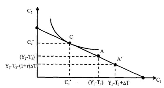 Точка, при которой текущее потребление в точности равно текущему располагаемому доходу (т. А) переместилась вдоль бюджетного ограничения (т. А'), все остальное осталось неизменным, т.е. оптимальное решение - это в обоих случаях т. С (