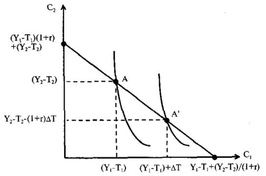 Оптимальное решение заемщика перейдет из т.А в т.А'. Из вышеприведенного анализа ясно, что часть потребителей при снижении налога увеличит текущее потребление, а, следовательно, совокупное потребление увеличится.