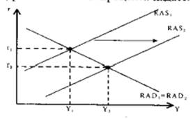 6. Снижение пособий по безработице увеличивает предложение труда, что сдвигает кривую реального совокупного предложения вправо, реальный выпуск растет, реальная ставка процента падает.