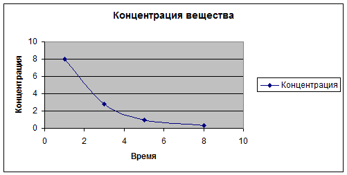 · Введите название диаграммы – Концентрация вещества, название осей Х и Y: Время и Концентрация соответственно, нажмите Готово. Получен график экспериментальных данных (рис 3).