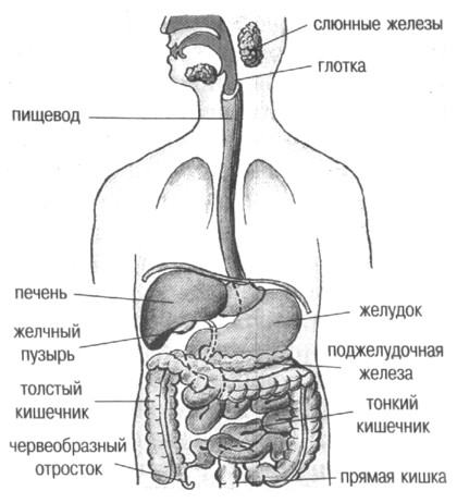 В пищеварительную систему входят пищеварительный тракт, печень и поджелудочная железа. Органы, составляющие пищеварительную систему, располагаются в области головы, шеи, грудной клетки, брюшной полости и полости таза. У человека пищеварительный канал имеет длину около 8-10 м и подразделяется на ротовую полость, глотку, пищевод, желудок, тонкую и толстую кишки. В глотке пищеварительный канал перекрещивается с дыхательным. После прохождения пищевода через диафрагму пищеварительная трубка расширяется, образуя желудок. Желудок переходит в тонкую кишку, которая подразделяется на двенадцатиперстную, тощую и подвздошную. Последняя впадает в толстую кишку, начальным отделом которой является слепая кишка с червеобразным отростком - аппендиксом. За ней следуют восходящая, поперечная, нисходящая, сигмовидная ободочные кишки, а затем прямая, заканчивающаяся заднепроходным отверстием. В двенадцатиперстную кишку впадают протоки двух крупных пищеварительных желез - печени и поджелудочной железы.