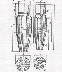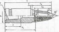 Фрезер-райбер ФРС предназначен для вскрытия "окна" в обсадной колонне для забуривания нового ствола при помощи отклонителя. Райберы изготовляются комплектно по три (№1, №2, №3) с последовательно увеличивающимися от №1 к №3 размерами. Вначале "окно" прорезается наименьшим фрезером №1, а затем фрезерами №2 и №3 оно расширяется. Фрезер-райбер - неразборная конструкция, наружная рабочая поверхность его наплавляется твёрдым сплавом. Конструктивные особенности показаны на рис.18.