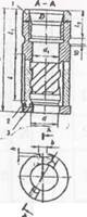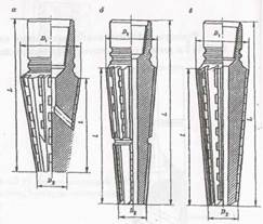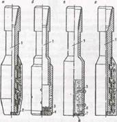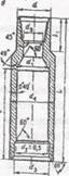 Печати различных видов применяют для определения места и характера нарушения обсадной колоны, а также для получения информации о предмете, находящемся в скважине. Наибольшее распространение получили свинцовые печати. Печати свинцовые предназначены для получения на торцовой или боковой поверхности отпечатков предметов, находящихся в скважине. Наиболее употребительные типы свинцовых печатей приведены на рис. 39. Для определения поверхности смятия или разрыва обсадных труб используют коническую печать (рис. 39, а) - металлический стержень с отверстием внутри для промывочной жидкости и с кольцевыми проточками для прочной связи свинца с корпусом. В верхней части печати имеется резьба для присоединения к бурильной колонне. Для определения характера слома бурильных труб и положения их в скважине применяют плоские печати (рис. 39, б,г). С помощью плоских печатей определяется также положение долота и металлических предметов, находящихся на забое.