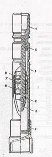 1-переводник; 2-гайка; 3,6-шпонки; 4-корпус; 5-ловильная цанга; 7-подвижный конус; 8-резиновое уплотнение; 9-наконечник