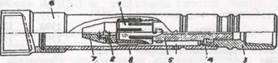 Труборез кумулятивный ТРК (рис. 36) предназначен для перерезания в скважинах различного вида труб (обсадных, бурильных, насосно-компрессорных). В корпусе 3 трубореза между двумя крышками помещается кумулятивный заряд 4, облицованный листовой медью и подпружиненный снизу. Внутри кумулятивного заряда находится удлиненный детонирующий заряд 5, корпус снизу герметизируется заглушкой 6 с двумя кольцевыми уплотнителями, а сверху- резиновым уплотнителем, внутри которого размещается изолятор и контакт.