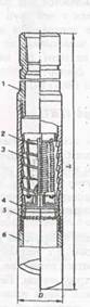Труболовка ТВУ (рис.6) предназначена для извлечения из скважины насосно-компрессорных, бурильных и обсадных труб диаметром от 60 до 114 мм. Корпус труболовки выполнен в виде конуса, переходящего в верхней части в цилиндр. Резьба на корпусе обратная по отношению к резьбе соединяющей колонны, на которой труболовка спускается в скважину. Максимальный наружный диаметр конической части корпуса на 2-4 мм меньше внутреннего диаметра извлекаемых труб. Каждая втулка имеет наружную цилиндрическую и внутреннюю коническую поверхности. Наличие разрезов позволяет ловильным втулкам деформироваться в различных направлениях. Наружный диаметр ловильных втулок на 0,5-4 мм превышает внутренний диаметр аварийной трубы. При работе труболовку спускают до верха извлекаемых труб, восстанавливают циркуляцию промывочной жидкости, замеряют давление и спускают труболовку до посадки. Повышение давления промывочной жидкости указывает на вхождение труболовки в обсадную трубу. При отсутствии его поворотом ротора на 30-50° перемещают труболовку. После захода труболовки в трубу циркуляцию промывочной жидкости прекращают и продолжают спуск труболовки, ловильные втулки сжимаются и входят внутрь трубы. При подъёме колонны труболовка заклинивает ловильные втулки, прижатые к захватываемой трубе, и поднимают колонну.
