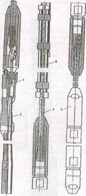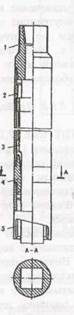 Труболовка ТВТ (рис.12) предназначена для захвата и извлечения ведущих труб. Переводник 1 имеет вверху замковую резьбу для соединения с корпусом 2. Последний представляет собой цилиндр с внутренней резьбой у концов с переводником и направлением 4. Внутри корпуса имеется цилиндрическая расточка, которая оканчивается выступом, ограничивающим перемещение цанги 3 вверх. Цанга состоит из кольца, удерживающих пластин и захватывающих клиньев.