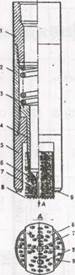Торпеда шашечная термостойкая ТШТ (рис. 33) предназначена для ликвидации заклинивания долот и элементов бурильной колонны (калибраторы, центраторы, расширители, турбобуры, трубы), а также для обрыва труб. Эта торпеда фугасного действия негерметична, заряд ВВ контактирует со скважинной жидкостью. ВВ для торпеды это ГФГ-2, ГИДС и НТФА. В зависимости от типа ВВ предельная температура для торпеды соответственно составляет 160, 200 и 250"С. Груз торпеды жёстко соединён с корпусом и используется многократно.