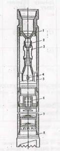 1-сопло насоса; 2-горловина; 3-диффузор; 4-каналы; 8-воронка; 6-фильтр; 7-каналы вертикальные; 5-переводник