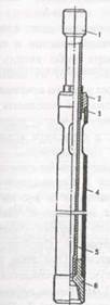 Гидравлический ударный механизм предназначен для ликвидации прихватов бурильных и обсадных колонн, испытателей пластов и так далее путем нанесения ударов, направленных снизу вверх либо сверху вниз в зависимости от сборки механизма. Он состоит (рис. 29) из шпинделя 1, переводников 2 и 7, цилиндра 3, имеющего две камеры разного сечения, боика,4, поршня 5 и штока 6. Вся система ГУМ герметизирована и заполнена маслом. Для работы с ГУМ отсоединяют неприхваченную часть колонны от прихваченной с помощью ловильного инструмента, а если верх извлекаемой колонны оканчивается замковой резьбой нижнего переводника 7, то ГУМ соединяют с аварийной колонной. Закреплению замковой резьбы переводника 7 способствует наличие шлицевой пары у переводника 2 и шпинделя 1. Затем натягивают бурильную колонну с усилием, превышающим её вес на 200-500 кН. Вначале скорость шпинделя с поршнем будет небольшой, так как он движется вверх за счёт перетока масла из верхней полости (большой) в нижнюю (малую) через три последовательных отверстия. Пройдя 213 мм, поршень попадает в цилиндр 3 с продольными пазами. При этом площадь сечения для прохода масла из большой полости в малую увеличивается почти в 200 раз. Масло свободно перетекает вниз, шпиндель 1 мгновенно перемещается вверх и бойком 4 ударяет по нижнему концу переводника 2. Этот удар передаётся прихваченному инструменту через корпус цилиндра 3 и переводник 7. Для повторного удара перегоняют масло из нижней (малой) полости цилиндра в верхнюю, для чего на шпиндель дают основную нагрузку 10-20 кН, направленную вниз. ГУМ готов к повторному удару.