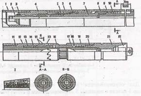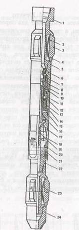 1-переводник; 2-пружина; 3-направляющая; 4-колъцо; 5-цилиндр; 6-игла; 7-втулка; 8-поршень; 9-насадка; 10-винт; 11-пружина; 12-кольцо; 13-толкатель; 14-муфта; 15-кольцо; 16-кольцоуплотнительное; 17-рычаг; 18-резец; 19-пружина; 20-ограничитель; 21-болт; 22-киппель; 23-центратор; 24-наконечник