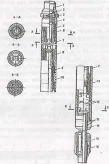 1-переводник; 2-кольцо; 3-хомут; 4-пружина; 5-муфта отбойная; 6-винты; 7-кожуха; 8-головка ударная; 9-шпин-дель верхний; 10-муфта соединительная; 11-муфта; 12-наконечник; 13-уплотнение; 14-ударник; 15-шпиндель; 16-наковальня