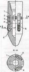 Труборез внутренний механический (рис. 37) предназначен для срезания труб, оставленных в скважине, с целью последующего удаления их из неё. Труборез состоит из корпуса 1, режущих пластин 3, часть наружной поверхности которых наплавлена твёрдым сплавом 4, и осей 2, с помощью которых пластины крепятся на корпусе. Труборез спускается в скважину на бурильной колонне, которая через циркуляционные отверстия 6 заполняется промывочной жидкостью. После установки трубореза на место восстанавливается циркуляция, и бурильную колонну вращают с минимальной частотой ротора 40-50 об/мин. Под действием перепада давления в 3-5 МПа режущие пластины выходят из пазов и, прижимаясь твердосплавной поверхностью к трубе, режут её. Время, необходимое для перерезания трубы, составляет 1-2 часа. По окончании работы нижние концы режущих рычагов выходят из пазов в корпусе. При этом промывочная жидкость выходит через отверстия в межтрубное пространство, давление снижается, что сигнализирует об окончании резания трубы. После выключения циркуляции режущие пластины под собственным весом опускаются, труборез извлекается из скважины.